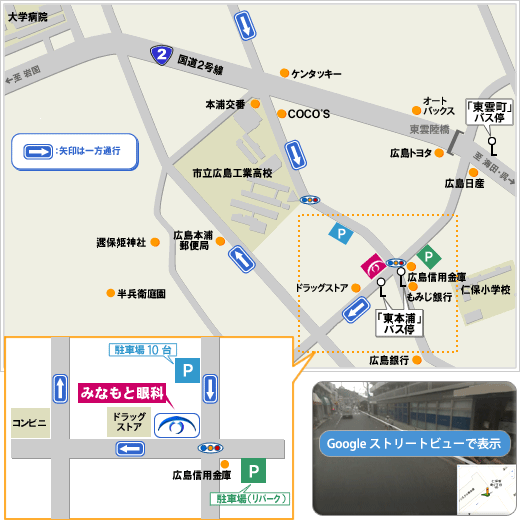 国道2号線,東雲陸橋手前の広島日産、広島トヨタの間を左折し最初の信号の交差点を渡りすぐ右側にございます。