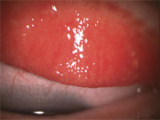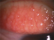 図1.季節性アレルギー性結膜炎(上まぶたの裏の結膜が充血し、乳頭とよばれる変化が強い)