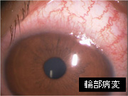 | アトピー性皮膚炎に合併して起こる慢性角結膜炎(病態の基本はアレルギー性結膜炎と同じ)で、アトピー素因を持つ人は,複数の抗原に対して反応が起きやすいために,年中さまざまな抗原にさらされて、慢性炎症を生じやすいと考えられます。 図2.アトピー性結角結膜炎(白目[結膜]と黒目[角膜]の境界部分で強い炎症がある) |