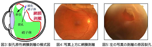 単に「網膜剥離」という場合には、裂孔原性網膜剥離といって、網膜の一部に裂孔(裂け目)ができて、そこから年齢とともに液化の進んだ硝子体が網膜下に入り込むことで網膜剥離を生じてくる病態のことを言います。放置しておくと網膜は全部剥離してしまい失明状態となります。
