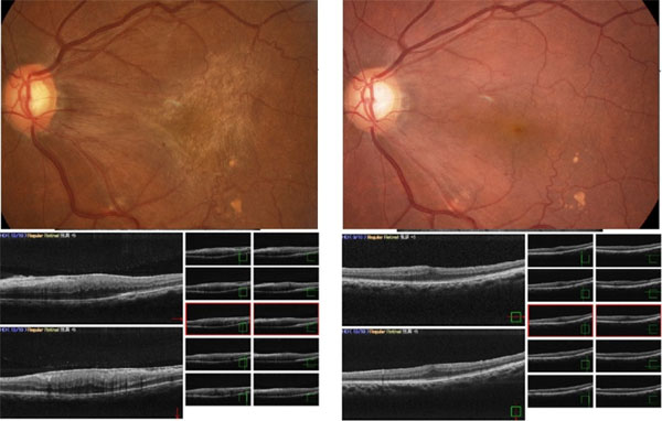 図5:網膜上膜.術前視力0.3(左).硝子体手術後に視力は