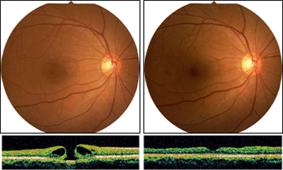 図6:黄斑円孔.術前視力0.09(左).硝子体手術後に視力は0.6に改善した(右).